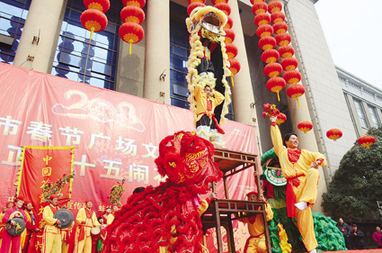 作為2013年蚌埠市春節廣場(chǎng)文化活動(dòng)的壓軸大戲,整場(chǎng)演出共有來(lái)自禹會(huì )區文化館、蚌山區文化館和龍子湖區文化館的8支花鼓燈表演隊先后登臺獻藝,一個(gè)小時(shí)的演出吸引了上千名市民駐足觀(guān)看。據市文廣新局負責人介紹,這8支花鼓燈隊伍從全市一百多支花鼓燈藝術(shù)團中脫穎而出,聚集在科學(xué)宮廣場(chǎng)上表演,為市民送上元宵節藝術(shù)大餐。