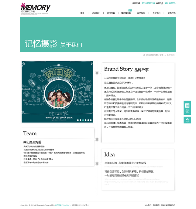 記憶視覺(jué)攝影有限公司(簡(jiǎn)稱(chēng):記憶攝影)記憶攝影正式成立于2008年,集頂尖攝影、造型妝容和后期特效專(zhuān)業(yè)力量于一體,是中國首批開(kāi)創(chuàng )外景旅行式婚紗攝影的工作室之一記憶攝影一直秉承“一對一的精致拍攝”服務(wù)理念。在整個(gè)拍攝過(guò)程中專(zhuān)業(yè)的攝影師、化妝師都會(huì )至始至終跟隨客戶(hù),顧客可以隨時(shí)和拍攝組進(jìn)行溝通和交流,不斷的創(chuàng )新獨特的拍攝方式為新人打造真正屬于自己的獨一無(wú)二的婚紗照片。做到真正的人性化,同時(shí)在更多程度上保證了照片的完美質(zhì)量,附加一份完美體驗。