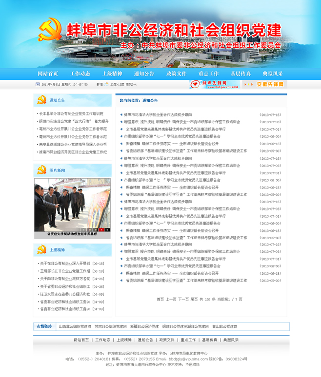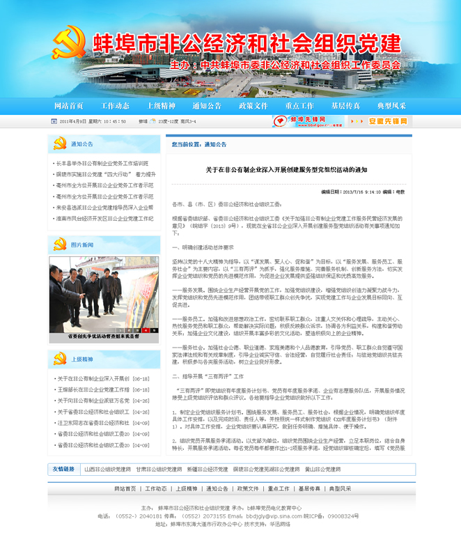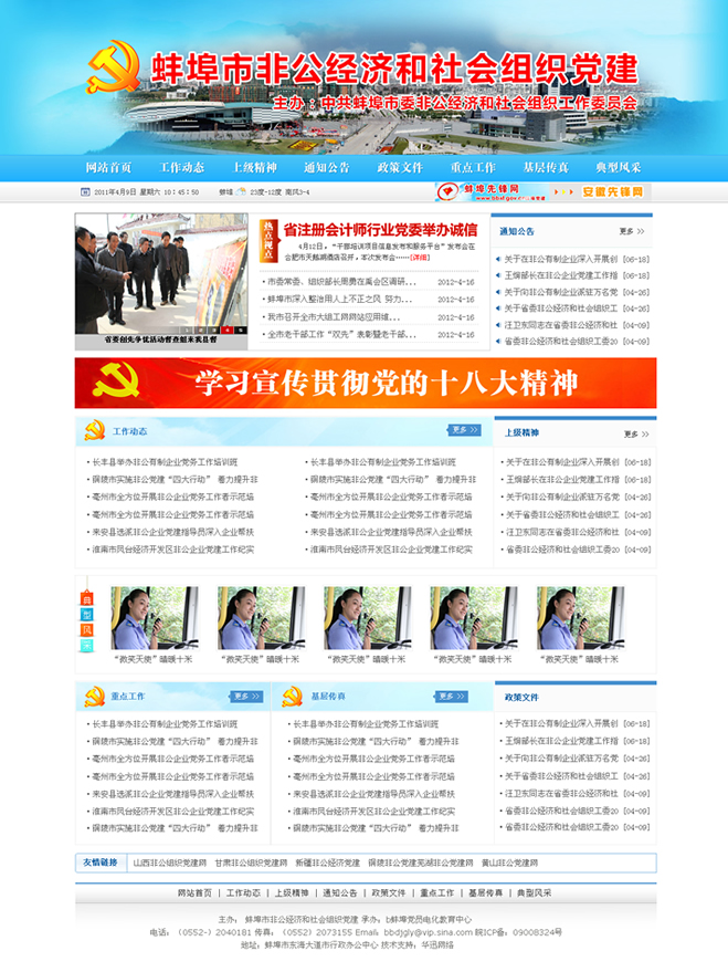 網(wǎng)頁(yè)由中共蚌埠市委非公經(jīng)濟和社會(huì )組織工作委員會(huì ),蚌埠先鋒網(wǎng)電教中心承辦,作為蚌埠先鋒網(wǎng)子欄目,主要用于蚌埠非公經(jīng)濟和社會(huì )組織黨建工作有關(guān)信息發(fā)布和經(jīng)驗交流。